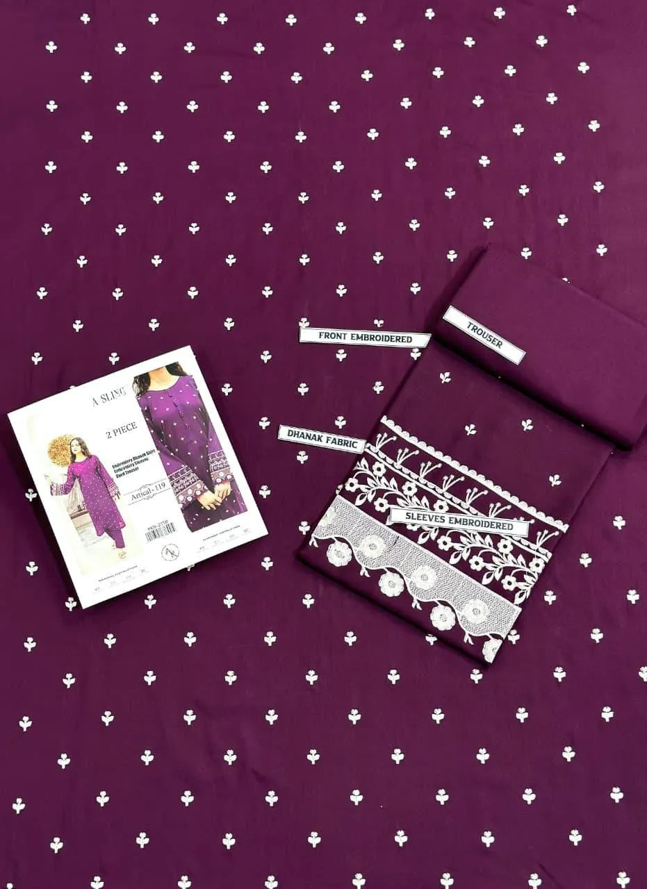 • Shirt Fabric: Dhanak• Pattern: Embroidered• Shirt Front Pattern: Embroidered• Sleeves Pattern: Embroidered• Shirt Back Pattern: Plain• Trouser Fabric: Dhanak• Trouser Pattern: Plain• Number Of Pieces: 2 Pcs• Package Includes: 1 x Shirt, 1 x Trouser• Shirt Cutting: 2.5 Meter• Trouser Cutting: 2.5 Meter• Color: Purple• Note: There might be an error of 1-3 cm due to manual measurement, and slight color differences may occur as a result of varying lighting and monitor effects.•